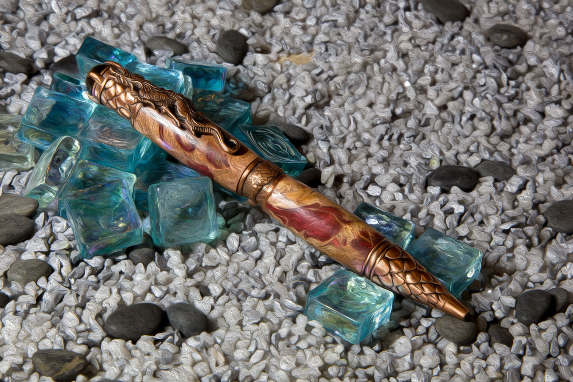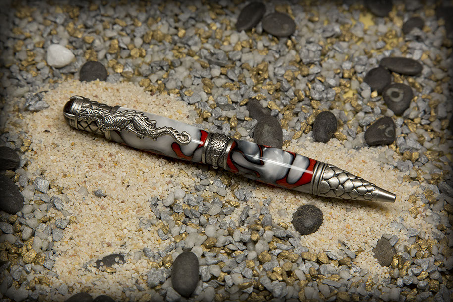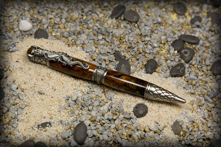 This dramatic and beautifully sculpted pen makes the perfect gift for any Dragon lover. Great attention is given to the exquisite details of the dragon. The clip is a full body, mighty crouching Chinese dragon. The band features a dragon claw grasping the center - a sign of strength and willpower. The pen tip and end cap are covered in the armored scales of the dragon; scales can be seen as a sign of protection. And the Tigers Eye crystal on the end, known to be very effective for instilling courage, strength of will and self-confidence - gripped in place by additional talons. Uses a popular Parker style refill.